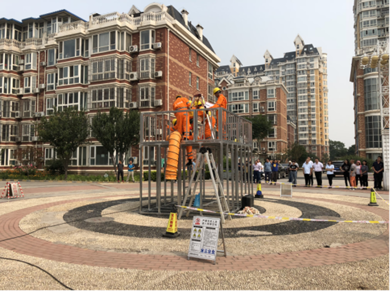 此次演练情景模拟有限空间井下取物作业,演练开始后,物业公司6名工作人员立即履行作业方案制定,作业审批手续,安全交底,设置警示标志,检查气体检测、通风、照明等设备,开盖自然通风,机械通风,用专业仪器进行有毒有害气体检测等工作流程,每个项目环环相扣,工作人员按照有限空间作业安全操作规程,认真、迅速、有序地完成每一项作业步骤。通过演练,强化了职工安全责任意识,有效检验了物业公司有限空间作业应急预案的实用性、可操作性和各部门的应急能力。此次活动累计发放安全知识宣传资料2600余份。